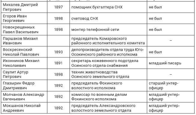 В Осинском уезде 11 октября исполком Сарашевской волости составил список «большевиков-коммунистов, изъявивших желание встать на защиту Советской власти, подлежащих отправке в Осинский советский батальон»123. Однако в списке из 21 человека согласились отправиться на фронт лишь трое.
