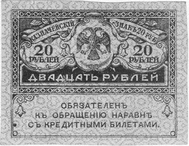 В сентябре появились бумажные деньги нового образца номиналом в 20 и 40 рублей. Их сразу стали называть "керенками" в честь главы Временного правительства – А.Ф. Керенского. Они были непривычно маленькие – чуть больше этикетки от спичечного коробка. Печатались новые купюры упрощенным способом и выпускались целыми листами: нужное количество надо было вырезать ножницами.
