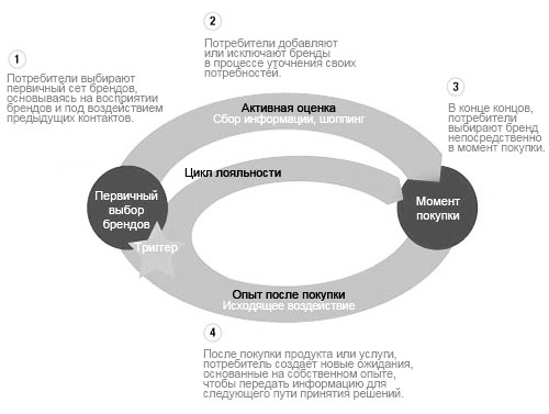 Расширяющиеся возможности выбора. Было доказано, что вложения в узнаваемость бренда все еще оказывают влияние на потребительский выбор: бренды, попавшие в первичный выбор, так называемую «лестницу предпочтений», имеют в три раза больше шансов быть купленными, чем не попавшие в него. Однако в большинстве индустрий это не делает данные бренды безусловными лидерами в процессе принятия потребительских решений. На стадии активной оценки потребители, получая новые возможности для лучшего изучения товарной категории, с большей вероятностью увеличивают, а не уменьшают количество брендов. Например, при выборе автомобиля покупатели добавляют 2,2 бренда к их первичному набору в 3,8 брендов, а при выборе уходовых средств добавляют 1,8 брендов к первичному набору в 1,5 брендов.