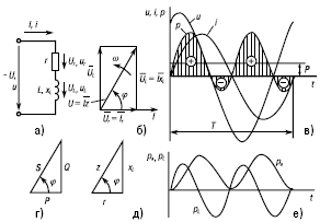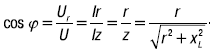 Графики u(i), i(t) изображены на рисунке 16в. Разделив стороны треугольника напряжений (рис. 16б) на ток, получим треугольник сопротивлений (рис. 16д), из которого можно определить косинус угла сдвига фаз между током и напряжением: