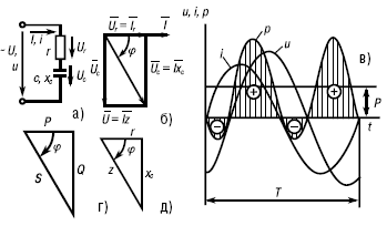 Рис. 16. Электрическая цепь, содержащая резистивный r и емкостный С элементы (а), ее векторная диаграмма (б), графики мгновенных значений (в), треугольники мощностей и сопротивлений (г и д)