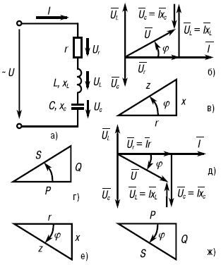 Рис. 17. Электрическая цепь, содержащая последовательно включенные r, L и С (а), ее векторная диаграмма (б), треугольники сопротивлений и мощностей (в и г) цепи при xL > xC, векторная диаграмма (д), треугольники сопротивлений и мощностей (е и ж) цепи при xC > xL.