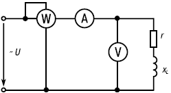 Измерение активной, реактивной, полной мощностей и cos φ, а также параметров цепи, например r и L, можно произвести с помощью ваттметра, амперметра и вольтметра, включенных в цепь по схеме, изображенной на рисунке 18.