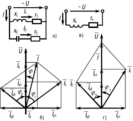 Как видно из векторной диаграммы, общий ток цепи совпадает по фазе с напряжением, если реактивные составляющие токов ветвей с индуктивностью и емкостью равны по модулю: I1p = I2p.