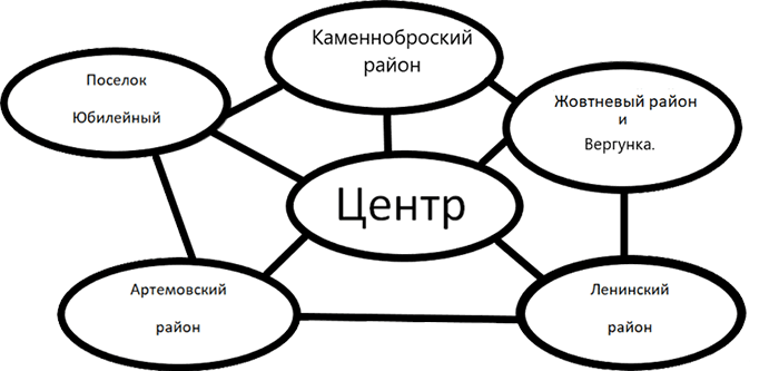 В основном мелкие туннели черного уровня привязывались к районам города: Каменобродскому, Артемовскому, Ленинскому, Жовтневому-Вергунке и поселку Юбилейному. Но в туннели эти районы «Отцы Основатели» разделили по-другому. Сделав самым огромным районом Центральный, который захватывал кусочки с других районов. И тем самым он стал в центре огромным бункером со своей инфраструктурой и главным пультом управления всего Гигатуннеля. А из него были входы во все другие районы. Остальные районы имели два рядом стоящих выхода и само собой в центр. Выглядело примерно так: