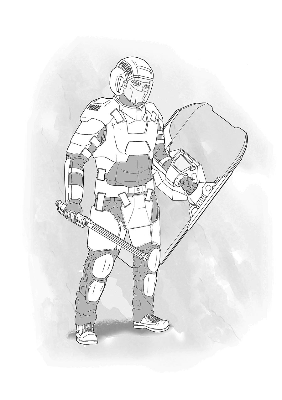 В отличие от большинства полицейских, носивших в городе повседневную форму тёмно-синего цвета, капитан Савин был одет в полевой камуфлированный костюм в расцветке ФирПат. Этот рисунок камуфляжа разрабатывался специально для долины Фьярвик и являлся визитной карточкой спецотряда «Рубеж». Ни гражданские, ни другие полицейские подразделения не имели права носить этот камуфляж, так что бойцы «Рубежа» непременно выделялись на фоне других подразделений в новостных выпусках с очередной спецоперации.