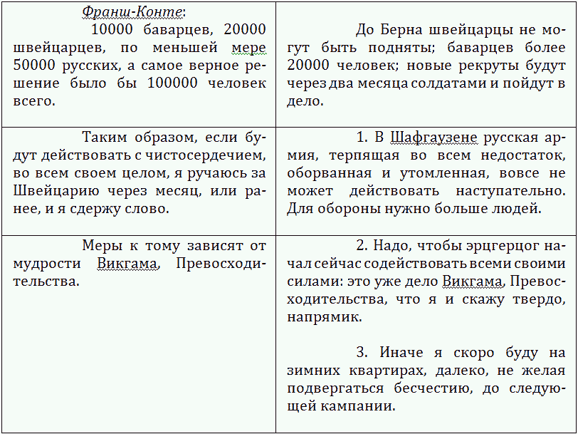 С другой стороны, Викгам, сопровождавший Коллоредо в Фельдкирх, сам изменил свой взгляд. Он убедился, вопреки мнению Вейротера, что, даже с корпусом Корсакова и принца Конде, Суворов располагал бы самое большее тридцатью тысячами человек, годных к походу. В то же время он составил себе довольно плохое мнение об этих войсках, храбрых, по его словам, но утративших всякую дисциплину со времени их пребывания в Италии и находившихся под начальством офицеров, которые, помимо полковой службы, ничего не смыслили на войне. Пообедав, наконец, с фельдмаршалом, он, хотя и был предупрежден и подготовлен к его выходкам, нашел его совершенно неспособным на какое-либо командование. Герой, только что прогремевший своими подвигами на всю Европу, выглядел совершеннейшим «дурачком»: с согнутыми коленями, с трясущимися головой и руками, он ходил из угла в угол по комнате, произнося бессмысленные слова. Когда Викгам заговорил с ним о плане кампании, который со своей стороны предлагал эрцгерцог, Суворов обратил к небу восторженный взор и сказал, что имел ночью видение, запретившее ему соглашаться на это. Минуту спустя он действительно изумлял своего собеседника, высказывая относительно австрийской армии оценку, носящую на себе отпечаток ума настолько же беспристрастного, сколько и рассудительного. Он продолжал разговаривать в течение двух часов о самых разнообразных предметах с полной ясностью и глубоким знанием; но, как только Викгам попытался вернуть разговор к военной действительности, фельдмаршал вновь принялся за свои разглагольствования, потом вдруг позвал одного офицера и продиктовал ему по-французски следующую заметку, в двух столбцах: