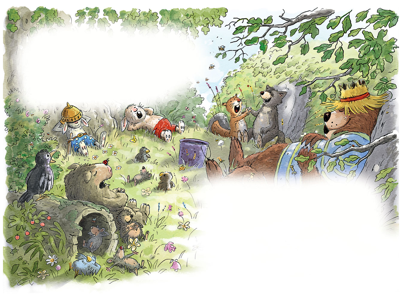 Однажды тёплым летним днём Волшебный лес погрузился в сон. Медведь-лакомка, Заяц-рыцарь (наверное, вы помните, почему их так зовут: Мишка любит полакомиться ягодами бузины, а Заяц очень храбрый, всегда ходит в шлеме и не расстаётся с мечом) и их соседи-зверушки нежились в тени ветвей старого дуба. Одни кружили в воздухе (это были жучки, пчёлки и бабочки), а другие, сладко посапывая, развалились в траве, как толстяк Якоб – двоюродный брат Зайца – и Морская свинка.