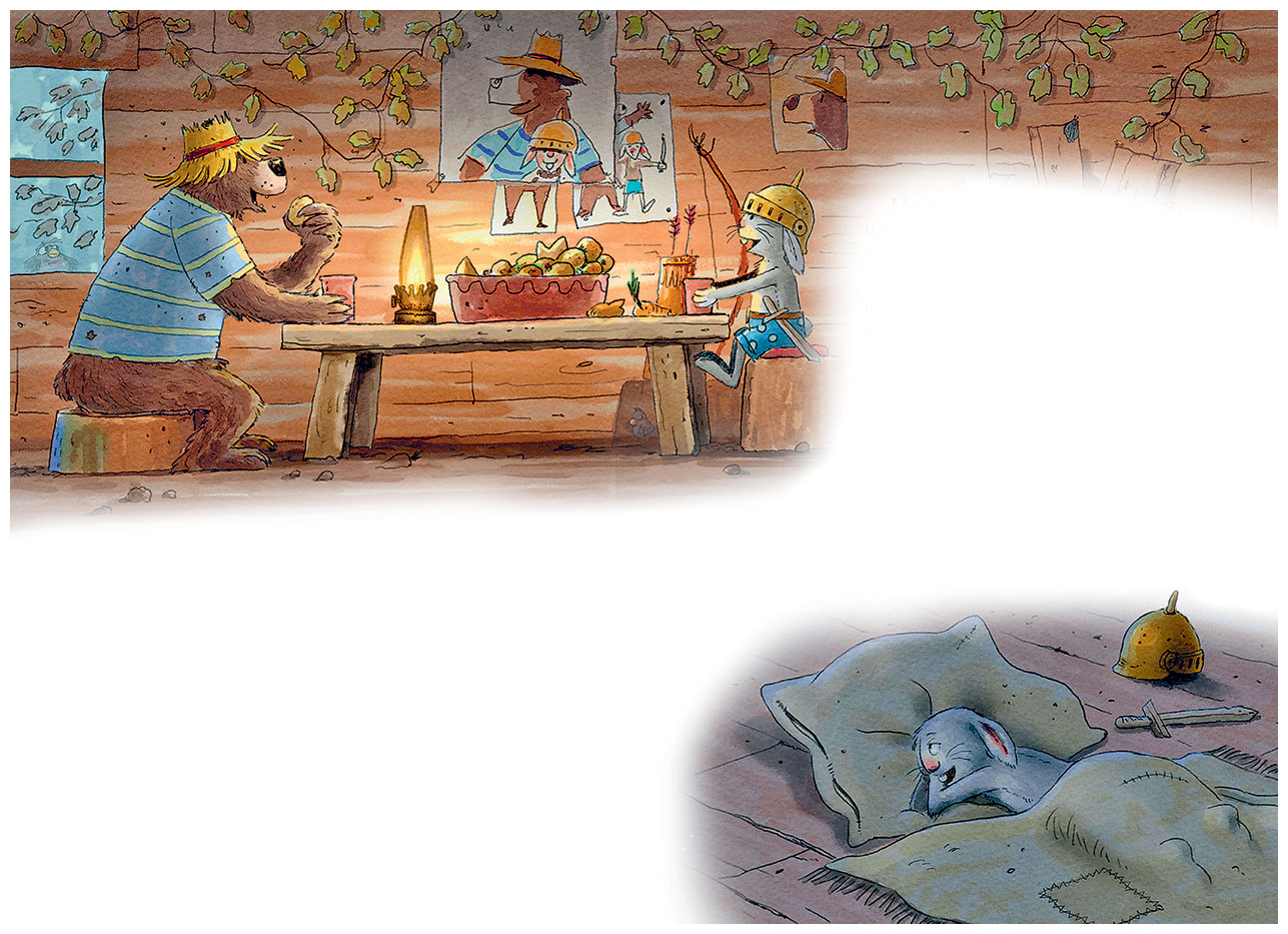 Медведь и не догадывался, что Заяц просто-напросто хитрил. Он конечно же заметил, в каком восторге был Мишка от рассказов тётушки Гусыни. «Вот было бы здорово, если бы можно было устроить Медведю сюрприз в виде театра! – думал он. – А потом мы бы приготовили праздничный ужин». От волнения Заяц долго не мог уснуть. «Да, это хорошая мысль, – решил он, засыпая. – Но, вероятно, для этого потребуется небольшая уловка…»