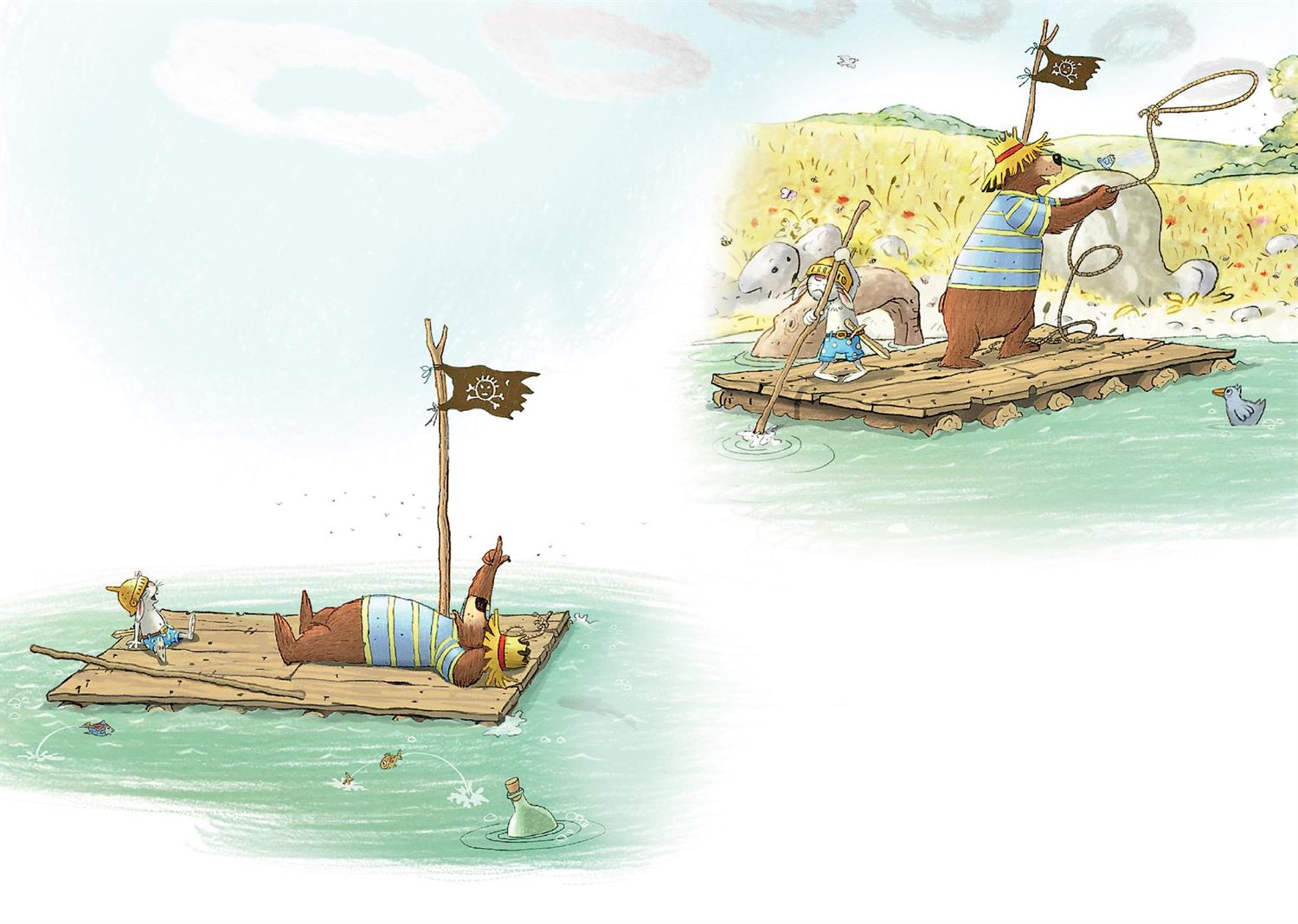 День выдался просто чудесным – жарким и солнечным. Заяц и его друг Медведь отправились в путешествие на своём новом плоту. Ярко светило солнышко, ласково пригревая им пушистые шкурки, и друзья, развалившись на досках плота, подставляли ему то один, то другой свой бочок. Даже река, казалось, хотела немного расслабиться – таким спокойным и ленивым было её течение.