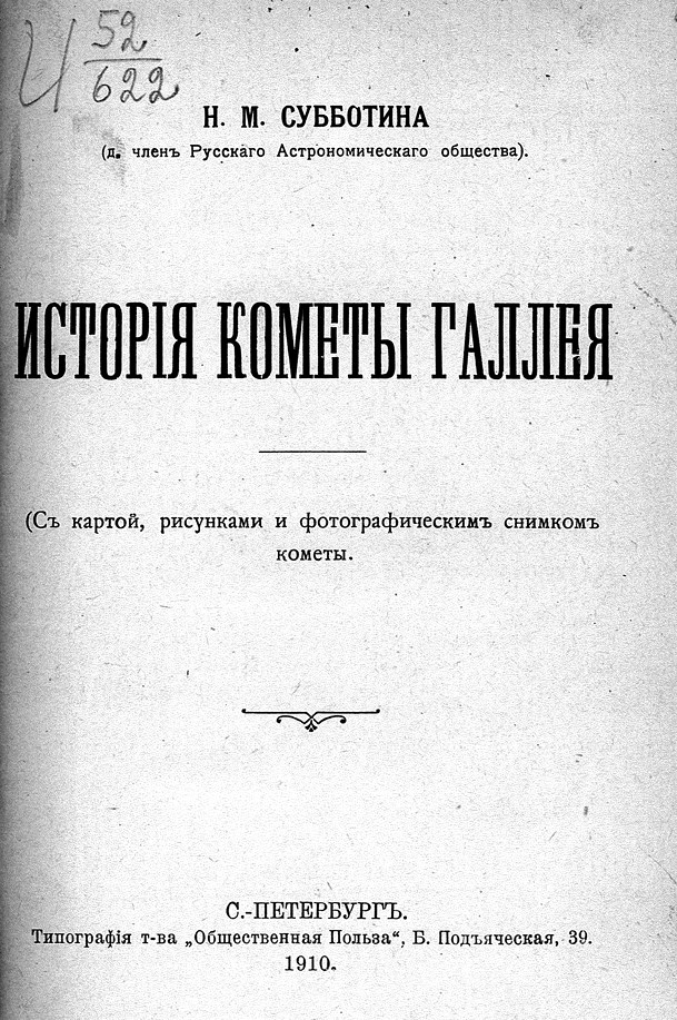 Рис. 20. Титульный лист книги Н. М. Субботиной «История кометы Галлея». 1910 г.