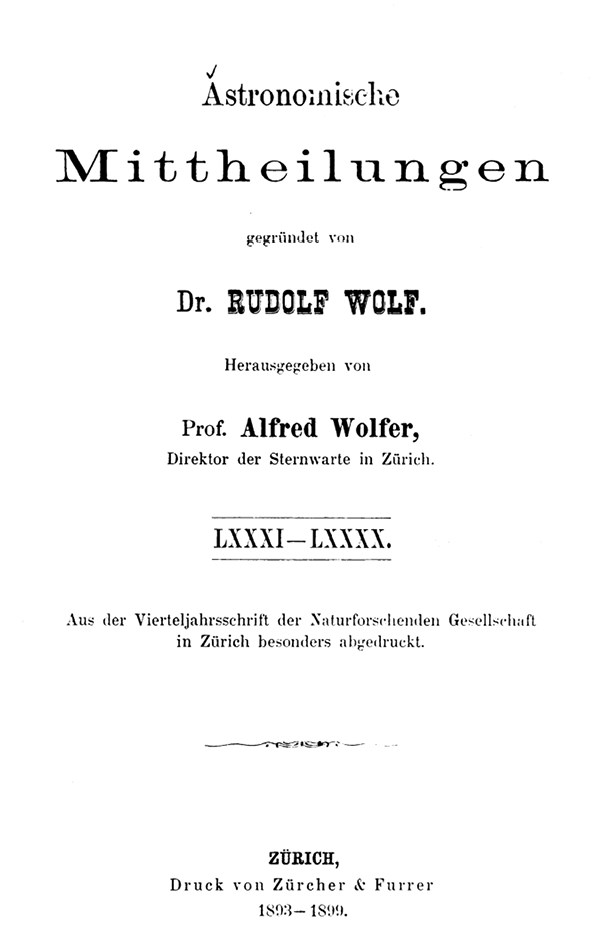 Барон с явным восхищением писал об организованной директором Цюрихской обсерватории профессором Вольфером программе наблюдений, в которой принимали участие астрономы из разных стран, включая самого барона Н. В. Каульбарса. «…Нельзя не отдать полной справедливости замечательным трудам в создании и правильной постановке наблюдений, предпринятых по инициативе директора обсерватории в Цюрихе в Швейцарии, – писал он, – профессора Wolfer, которому удалось привлечь к наблюдениям пятен: 1 обсерваторию в Швейцарии, 3 – в Италии, 2 в Австрии, 2 – в России (Юрьев и Харьков) и 3 – в Америке. Из частных лиц выразили желание принять участие в этом международном предприятии к сожалению всего 7 лиц, а именно 1 – в Америке, 2 – в Германии и 4 – в России (в Москве – г-н Вайнон, в Ярославле – г-н Миркович, в С.‐Петербурге – г-жа Фрейнберг и, наконец, в Гельсингфорсе, а теперь в Петербурге я)». «Все эти 19 пунктов наблюдения, в том числе 12 обсерваторий и 7 частных наблюдателей, ежегодно в январе месяце посылают свои наблюдения профессору Wolfer в Цюрих, – продолжал он, – где все полученные сведения ежегодно разрабатываются, а засим публикуются в “Astronomische Mittheilungen”, очень полезном журнале, в котором не только обнародываются общие результаты, выведенные из наблюдений 19-ти станций, но и отдельно еще весь материал, собранный каждой из них. Последнее позволяет не только самой Цюрихской обсерватории, но и кому угодно, свободно пользоваться и делать выводы из всего собранного материала»174.