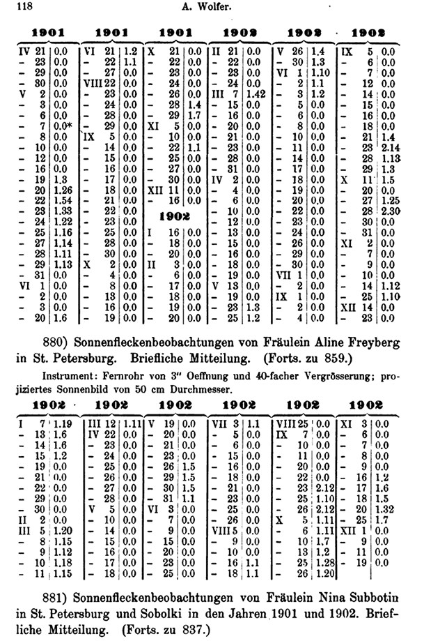 Немного позже в том же году А. Шмоль опубликовал обстоятельный отчет, озаглавленный «Текущий минимум солнечных пятен»199, содержащий анализ солнечной активности за 1898–1900 гг. Статья основана на работах Moйе (Монпелье), Субботиной (Санкт-Петербург) и Гобера (Gaubert, Мартиника)200. Она содержит таблицы и диаграммы солнечной активности, построенные на основе данных указанных наблюдателей201. Казалось, факты указывали на период спада солнечной активности, однако автор не был окончательно в этом уверен, считая имеющиеся в распоряжении данные не совсем достаточными. Так же как и предыдущий доклад А. Шмоля, доклад 1901 г. попал в «Astronomischer Jahresbericht», в котором была напечатана краткая аннотация, упоминающая в том числе и имя Субботиной202. Краткая выжимка из этого отчета, включавшая количество солнечных пятен, наблюдавшихся в период с 1889 по 1900 г., опубликована в ежегодном издании «Annuaire Astronomique et météorologique». В ней также указывалось на видимый минимум наблюдавшихся в 1900 г. солнечных пятен, хотя уточнялось, что цифра за 1900 г. является еще только приблизительной, но что «замечания г-на Гийома в Лионе, Мойе в Монпелье, Дюмениля в Йеблероне, мадемуазель Субботиной в Санкт-Петербурге подтверждают это снижение»203.