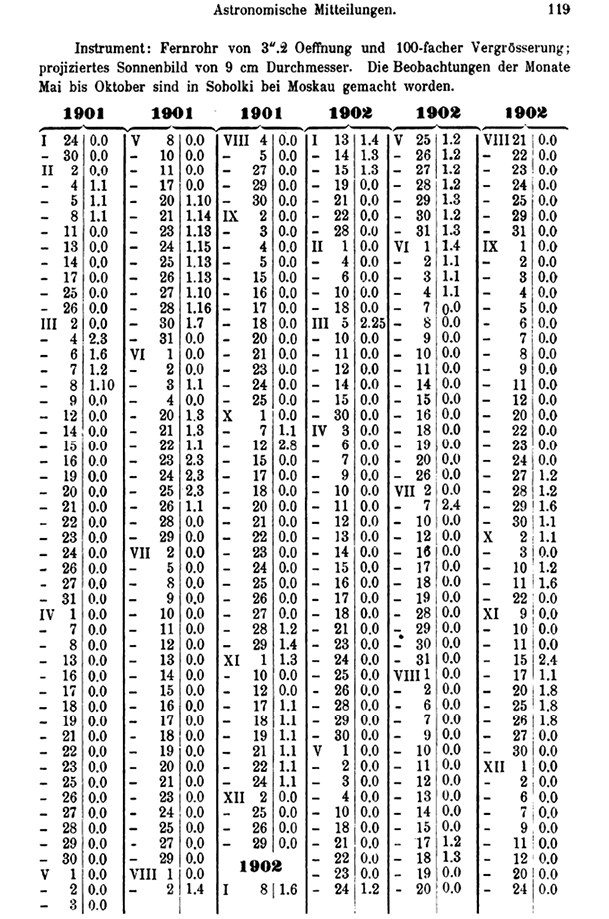 Каждый наблюдатель, участвовавший в работе профессора Вольфера, должен был выполнять следующую программу. «Что касается самих наблюдений, – пишет об этом барон Каульбарс, – то хотя на всех этих станциях они производятся различными способами, в зависимости от имеющихся у наблюдателя средств, тем не менее везде, для каждого наблюдения, за исключением дней, когда “Солнце – чисто”, делается тем или иным способом рисунок или фотографический снимок Солнца и за каждый раз подсчитываются следующие данные: 1) число групп пятен и факелов, насколько они для глаза наблюдателя имеют отдельное друг от друга значение. Эти данные не существенны и имеют только ориентировочное значение. Группы обозначаются цифрами, знаками алфавита или иным способом и рядом с обозначением дня и часа наблюдения записываются в отдельные графы общего реестра – списка. 2) Самое важное научное значение каждого отдельного наблюдения составляет тщательный и требующий напряженного внимания подсчет пятен, причем черные ядра общего заключающегося в одной и той же полутени (Penumbra) пятна считаются за отдельные пятна. Число пятен в каждой группе записывается рядом с рисунком для точного своего контроля, а общая сумма всех пятен – в соответствующую графу упомянутого общего списка. Едва заметные для глаза и требующие напряженного внимания со стороны наблюдателя, чтобы быть замеченными “группы пор”, состоящие из огромного числа очень мелких и скученных на небольшом пространстве, как кажется, отверстий, сосчитать которые отдельно нет никакой возможности, как очень неопределенное явление, вовсе не принимается в расчет; за пятна их считать нельзя, ибо они с очагами извержения газов ничего общего не имеют. Только будущие очень тщательные наблюдения на первоклассных обсерваториях, со временем, быть может, выяснят их характер. 3) В январе каждого года всем вышеозначенным данным за минувший год проводится общая по каждой рубрике отдельная сумма и обозначается число наблюдений и число сделанных рисунков или снимков в году; после чего общий список отправляется для разработки в центральное учреждения, т[о] е[сть] <…> профессору “Wolfer” в Цюрих, с французским или немецким текстом. Вот те данные, которые, судя по тому, что ежегодно публикуется в “Astronomische Mittheilungen”, получает из всех 19 станций профессор Wolfer»176.