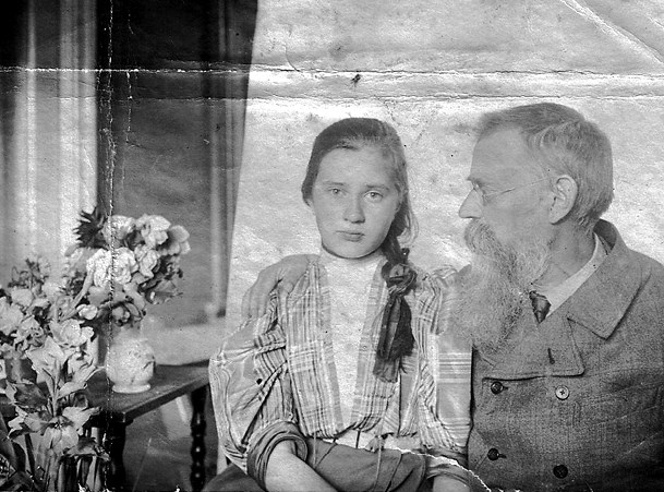 Рис. 13. Ольга Михайловна Субботина, младшая сестра Н. М. Субботиной, с отцом М. Г. Субботиным на террасе в Собольках. 1909 г. (Домашний архив И. Куклиной-Митиной)
