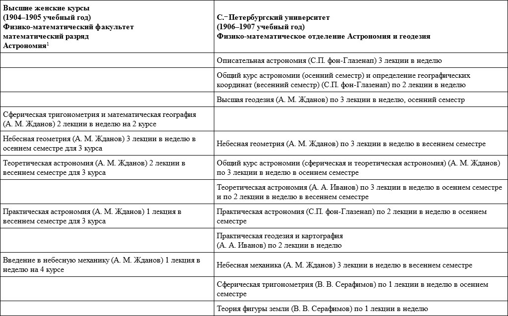 Лекционные курсы по специальности «Астрономия» на Бестужевских Высших женских курсах и в С.‐Петербургском университете 388