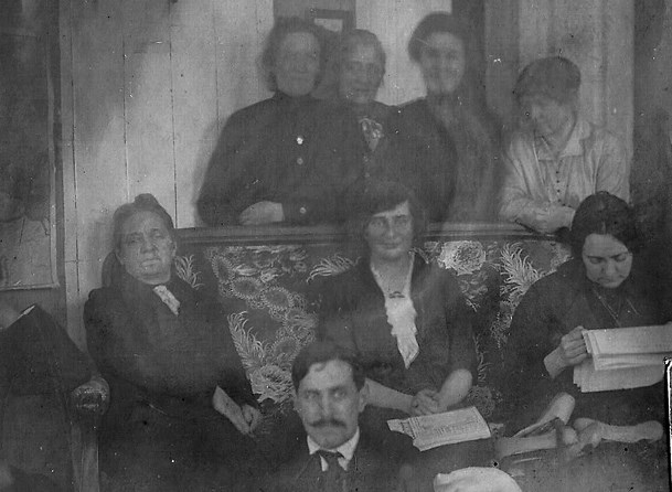 Рис. 15. Н. М. Субботина (крайняя справа), читает газету (Домашний архив И. Куклиной-Митиной)