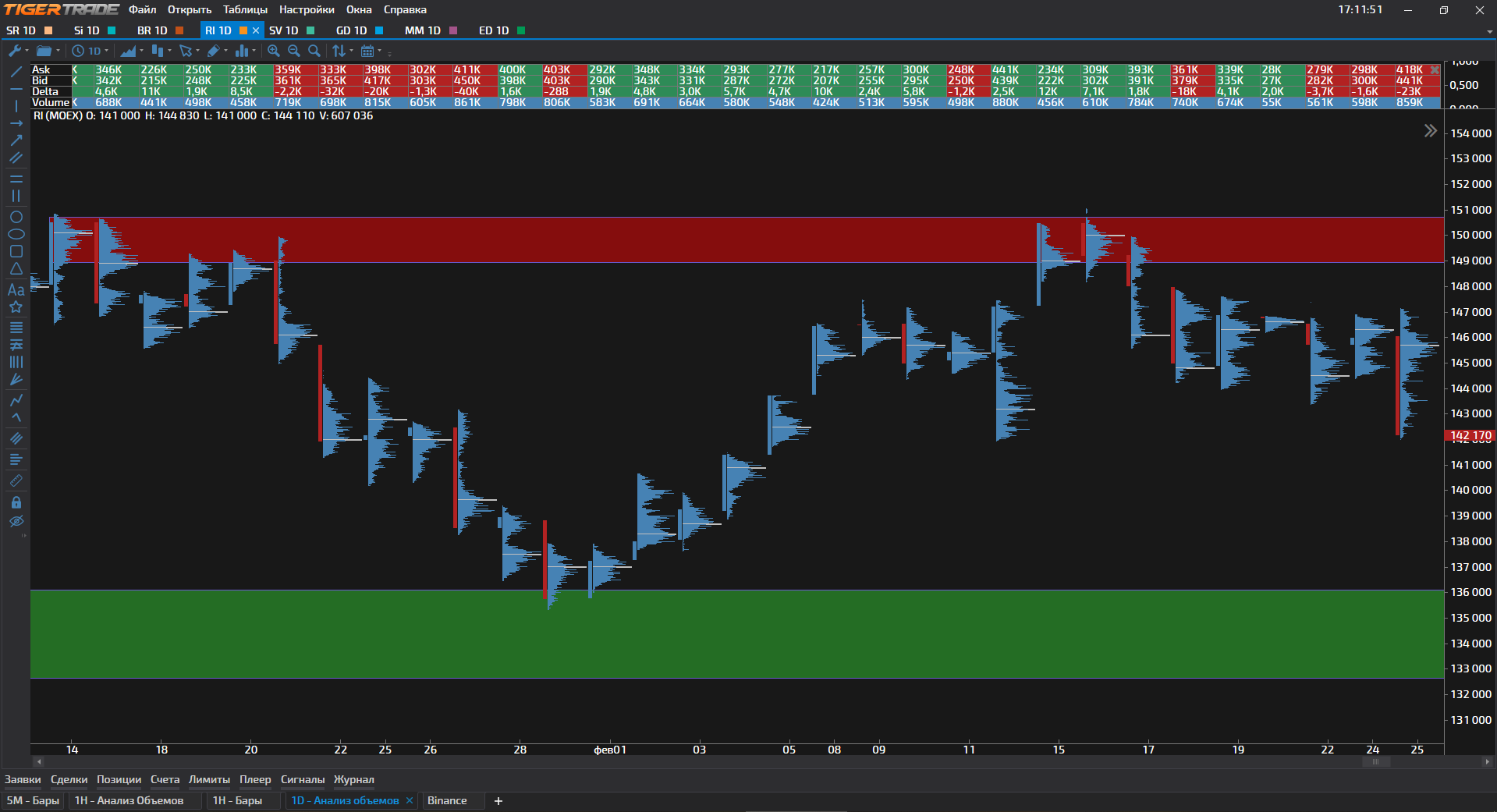 Зону лимитных ордеров можно представить в виде эдакой стены. Если она плотная, контрактов много, то потребуется большое количество усилий (рыночных покупок или продаж), чтобы ее пробить. Поэтому очень часто от таких областей цена отскакивает обратно и потом либо разворачивается, либо предпринимает еще одну попытку продавить.