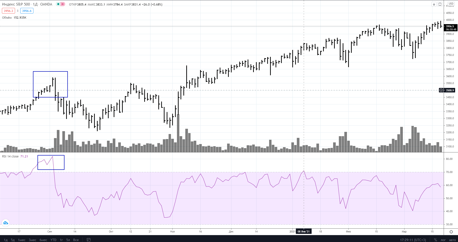 Например, на рисунке 1.3 показан этот индикатор и его сигнал о перекупленности рынка в сентябре 2020 года: