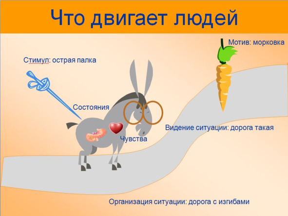 Морковка перед глазами – мотиватор, это побуждает (вызывает желание) ослика идти вперед и задает направление движения. Этим пользуется Душка.