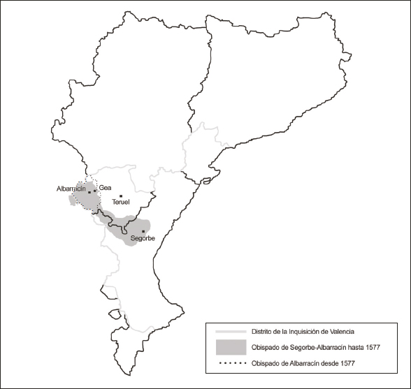 Más importante aún fue la doble e incluso triple condición jurisdiccional en la que se ubicaba la villa. Por un lado, Gea de Albarracín pertenecía al Reino de Aragón y, por tanto, le incumbían sin duda sus fueros e instituciones. Sin embargo, toda la zona sur del reino correspondía al distrito inquisitorial de Valencia. Las demarcaciones inquisitoriales fueron ya estudiadas por Jaime Contreras y Jean Pierre Dedieu,2 que analizaron las causas del origen de los distintos tribunales y su evolución territorial en el tiempo. En principio, la distribución de los tribunales del Santo Oficio estaría más próxima a las circunscripciones religiosas que a las civiles, pero ni siquiera se tomaron exactamente las fronteras episcopales para establecer las inquisitoriales y, además, a partir de 1510 puede apreciarse una remodelación de los distritos en función de necesidades prácticas (comunicaciones, control eficaz del distrito, etc.) y una cierta concepción más racional del espacio en cuanto a fronteras y extensión. Por otro lado, la Inquisición buscará siempre la libertad de acción frente a otros poderes y a las oposiciones que surgirán en los territorios, algo especialmente destacado en Aragón. Por ejemplo, en relación con la zona que nos ocupa, en 1518 los síndicos de Teruel exigieron su traspaso del tribunal de Valencia al de Zaragoza. Aunque coyunturalmente se les dio satisfacción, apenas cuatro meses después el cambio fue revocado y la ciudad volvió a manos del tribunal valenciano. Así, la evolución de los distritos no responde a otras razones que no sean las de autonomía y control del territorio. En algunas ciudades de la Corona de Aragón, las redes locales de familiares y comisarios vinieron a paliar posibles problemas de control de zonas alejadas. Este es el caso de la ciudad de Teruel, donde un teniente de inquisidor ejercía aún en 1571 cierta autoridad sobre los familiares e incluso se le atribuye haber penitenciado a algunos moriscos por su cuenta.