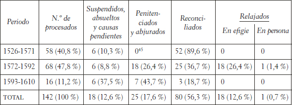45 Al no conservarse las relaciones de causas de Gea hasta 1568, de antes de ese año tan solo conocemos a los reconciliados o relajados a través de las relaciones de sambenitos u otras fuentes.