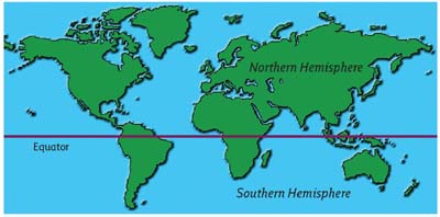The sections have also been divided into those for northerly people and those for southerly, because exactly what you’ll see depends on whereabouts on our planet you live. If you’re well into the northern hemisphere (the bit above the equator on the map) then go for the northern charts, while if you’re in the southern… well, you get the idea. As most of the land – and the majority of the world’s population – is in the northern hemisphere, the charts appear as if you are looking south. The closer to the equator you are in the northern hemisphere, the more of the southern chart you can use. For those lucky souls who live on the equator, the whole sky is visible and you can use both charts at once.