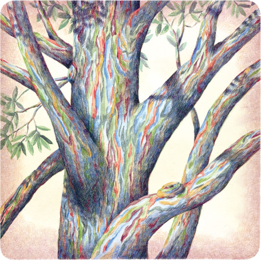 Если бы это необычное дерево, радужный эвкалипт, росло в саду у Винсента ван Гога, то он бы, не задумываясь, его нарисовал. Весь его ствол как будто украшен разноцветными полосками: ярко-зелёными, голубыми, фиолетовыми, оранжевыми, красными и тёмно-бордовыми. Кажется, что это краска, но на самом деле эти цвета по мере созревания приобретает кора, а слои отшелушиваются неравномерно.