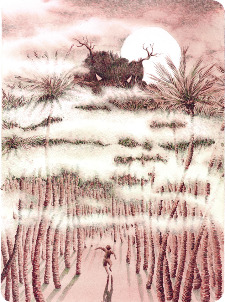 Легконог был не робкого десятка, но, когда он в сгущающихся сумерках оказался под высокими деревьями, сердце у него забилось часто-часто. Ветер пел свою жалобную песнь в верхушках пальм, и казалось, что деревья склоняются к нему, пытаясь о чём-то предупредить. Он уже захотел вернуться домой – дома-то безопасно, не то что здесь, это точно, – но как же Онглок?.. Поэтому мальчик собрал всё своё мужество и решил продолжить начатое. Осмотрелся вокруг в поисках пальм, под которыми можно было бы вырыть ямки.