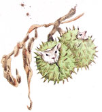 Он взял свой волшебный посох, постучал по стволу, и в ту же секунду маленькие ежата превратились в три крепко сидящих на ветке каштанчика – три нежных орешка в грубой скорлупе и колючей кожуре.