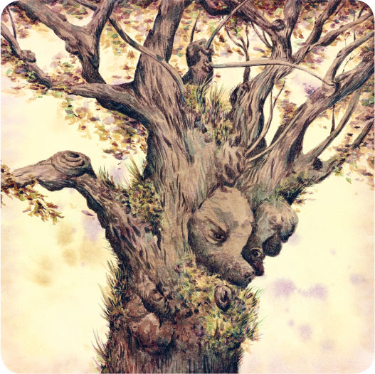 Когда к их жилищу пришёл дух леса, они спрятались на большом каштане, думая, что там-то они в безопасности.