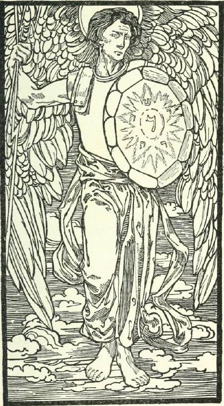 This armor fits thy form as if 'twere madeWith thee. Behold! our glorious banner comes,From which God's name and ensign grandly beam,While yon high sun doth promise thee success.Here come the chiefs, to greet thee as the headOf the celestial legions that have swornGod's standard to uphold. Take courage, then,Prince Michael, thou shalt battle for thy God.Michael: