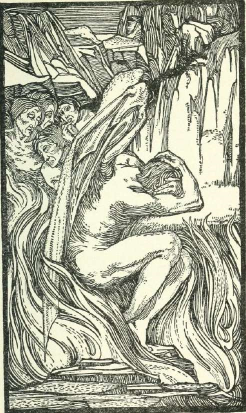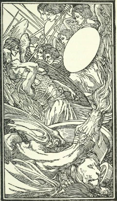 Even as bright day to gloomy night is changed,Whene'er the sun forgets his golden glow,So in his downward fall his beauty turnedTo something monstrous and most horrible:Into a brutish snout his face, that shoneSo glorious; his teeth into large fangs,Sharpened for gnawing steel; his hands and feetInto four various claws; into a hideOf black that shining skin of pearl; while fromHis bristled back two dragon wings did sprout.Alas! the proud Archangel, whom but nowAll Angels honored here, hath changed his shapeinto a hideous medley of seven beasts,As outwardly appears: A lion proud;A greedy, gluttonous swine; a slothful ass;A fierce rhinoceros, with rage inflamed;An ape, in every part obscene and vile,By nature lewd and most lascivious;A dragon, full of envy; and a wolfOf sordid avarice. His beauteous formIs now a monster execrable, by GodAnd Spirit and man e'er to be cursed. That beastDoth shrink to view its own deformity,And veils with darkling mists its Gorgon face.Rafael: