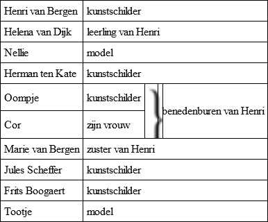 Henri (haar op haar neus tikkend). Jij hebt een mooi figuurtje Nel, en een mooi gezichtje – nou – maar soms wil ik meer hebben, hè: – het „ideale” model, hoe zal ik zeggen, dat zou zelf moeten leven, zie je, ik bedoel „meeleven” – ik bedoel als ’t ware „meeschilderen”, enfin: de ziel aan ’t stuk geven, hè – een lijf is niet genoeg – .