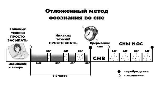 Скорее всего, сон в следующие 2—3 часа не будет непрерывным. Тебя ждёт череда сновидений, между которыми ты будешь просыпаться и засыпать снова. На этих пробуждениях можно повторять СМВ, но не целиком 4—8 минут, а по-быстрому – 1—2 минуты. Не помешает и повторять себе, что в ближайшем сновидении ты обязательно осознаешься.
