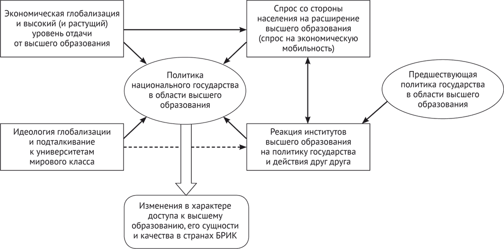 Другие страны стремятся копировать эту модель, возможно, потому, что им хочется что-то противопоставить экономическому господству США. Они надеются, что с ее помощью смогут вырастить такую же инновационную и высококвалифицированную рабочую силу, и та создаст такие же мощные инновации, отдача от которых и тянула за собой экономический рост США на протяжении последних 30 лет (см.: [Li, Shankar, Tang 2011]). Так что за стремлением стран БРИК скопировать американскую или европейскую модель исследовательского университета стоит стремление сделать их экономику более конкурентоспособной по сравнению с экономикой развитых стран. Экономический рост и сам по себе является важным источником политической легитимности для правительств стран БРИК. Помимо этого, университеты «мирового класса» представляются символами модернизации и развития, подкрепляя заверения государства в том, что его нация – полноправный игрок на мировой арене, конкурирует с США, Европой, Японией и другими развитыми странами.
