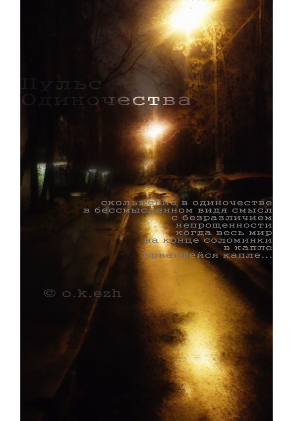 Как будто растворилсяУлетевКак будто не взаправдуСвет в окноИ оставляет метро следВсе равноНе взаправдуОпятьОпять все равноИ все эти людиНарисованы меломИ я среди них обычным мелкомНо все, что с любовьюНе может быть подлоВсе, что с любовьюНе все равноА, впрочемНе хочется пафосаТаскать слово любовьСмотреть с поволокою приторнойМы снова пытаемся смешать нашу кровьКоторую с пола вытерли…«Смотрю в глаза осени…»