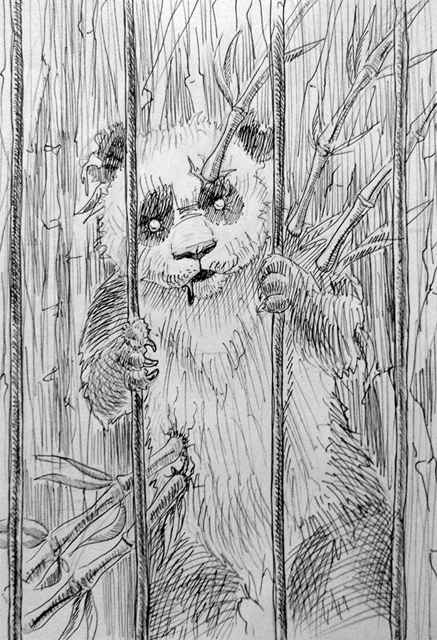Неожиданно я почувствовал на себе взгляд и оглянулся. На меня немигающим взором смотрела огромная панда. Мёртвая, она сидела внутри большой неповреждённой клетки. Лапами животное обхватывало прутья и ритмично покачивалось из стороны в сторону.