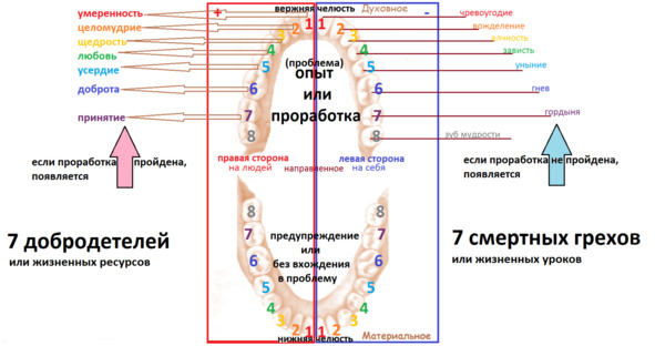 Проблемные зубы – 11, 21, 31, 41 – это передние или центральные резцы (31, 41 или нижние – предупреждение о проблеме от окружающего мира; 11, 21 или верхние – вы в стадии проработок или уже в решении проблем; 21, 31 или слева – направленное на себя; 11, 41 или справа – на социум). Даже оскома на передних зубах – первый признак.