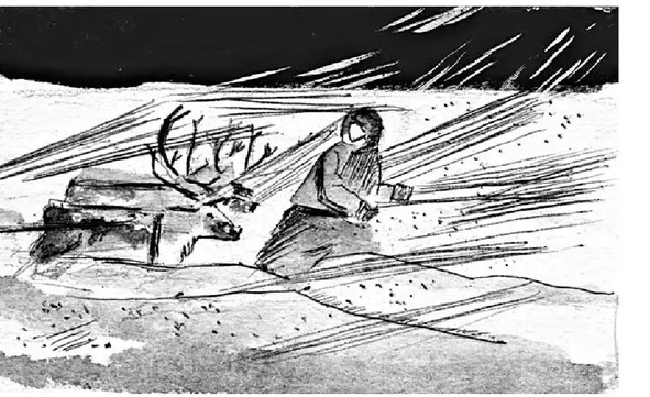 К моему счастью, из-за туч появилась круглая луна и осветила тундру своим ярко-желтым диском. Я остановился и решил пройтись пешком, ведя за собой оленей с загруженными нартами. Озираясь по сторонам и глядя себе под ноги, я стал искать свежие следы оленей, но их как назло нигде не было. Вдруг я заметил свежий след от нарт. Человек ехал на трех оленях. Может быть, это кто-то из наших соседей ездил проверять капканы? Я решил поехать по этому следу, куда бы он меня ни привел.