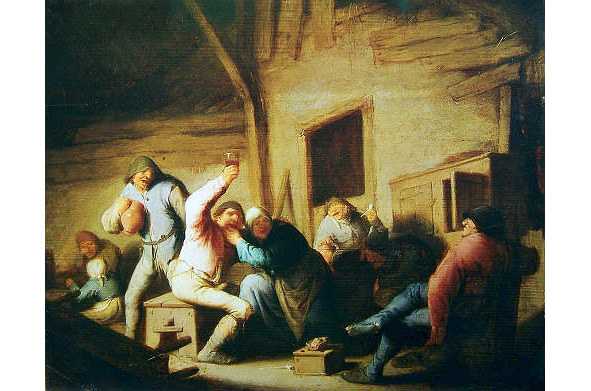 Надо сказать, крестьяне и у Браувера, и у Остаде никогда не выглядят несчастными, забитыми, подавленными нуждой и невзгодами. Наоборот: эта публика не знает удержу в проявлении своих эмоций. Картины Остаде (даже по сравнению с картинами Браувера) просто на грани китча. Брутальность участников сцены приводит в замешательство. Это уже и не крестьяне вовсе, а какие-то буйнопомешанные без малейшего понятия о приличиях. Им море по колено, а под горячую руку лучше не попадаться. Их простота доведена до абсурда. И при этом крестьянин в дырявых башмаках, сидящий к нам боком, может воображать себя кем угодно, хоть Юлием Цезарем (если ему, конечно, о данном историческом персонаже что-то известно). То есть спеси мирного землепашца можно позавидовать.
