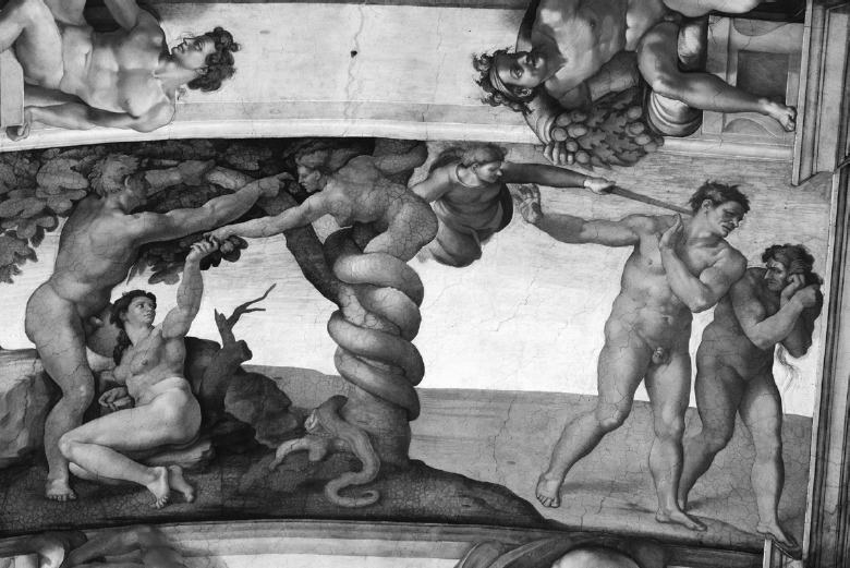 Figure 1: Michelangelo’s painting in the Sistine Chapel in Rome shows, on the left, Eve taking the fruit from the serpent. Notice that the body of the serpent changes into the form of a woman. On the right are Adam and Eve being banished from the Garden of Eden by an angel with a sword (Genesis 3:23–24).