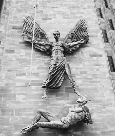 Figure 1: Statue of the Archangel Michael defeating the devil (Coventry Cathedral). Christians hold that it is the power of love that can defeat the forces of evil and that this love was shown most clearly in Jesus’ life, teaching and death.