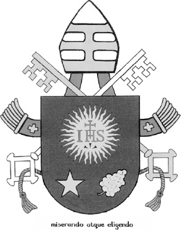Figure 4: The papal crest of Pope Francis, showing the crossed keys of St Peter which appear on every papal crest. The letters ‘IHS’ are the first three letters of the Greek word for ‘Christ’. The motto below the crest reads ‘miserando atque eligendo’ (‘by showing mercy and by choosing’).