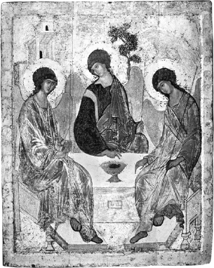 Figure 3: Andrei Rublev’s extraordinary icon of the Old Testament Trinity, depicting the three visitors who came to Abraham (Genesis 18:1–15), shows God as three persons – Father, Son and Holy Spirit – sitting at a table with a fourth place set for the viewer. The chalice (the cup used for wine in Catholic and many other Christian services) symbolises the Eucharist or Mass in which Christians participate. The figures are not looking at each other but form a circle to include the viewer.