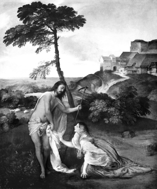 Figure 1: This painting by Titian shows Jesus still with a few grave clothes after his resurrection. Mary Magdalene is trying to touch Him and Jesus is pulling away. Mary is shown here with ginger hair, and this has significance (see here).