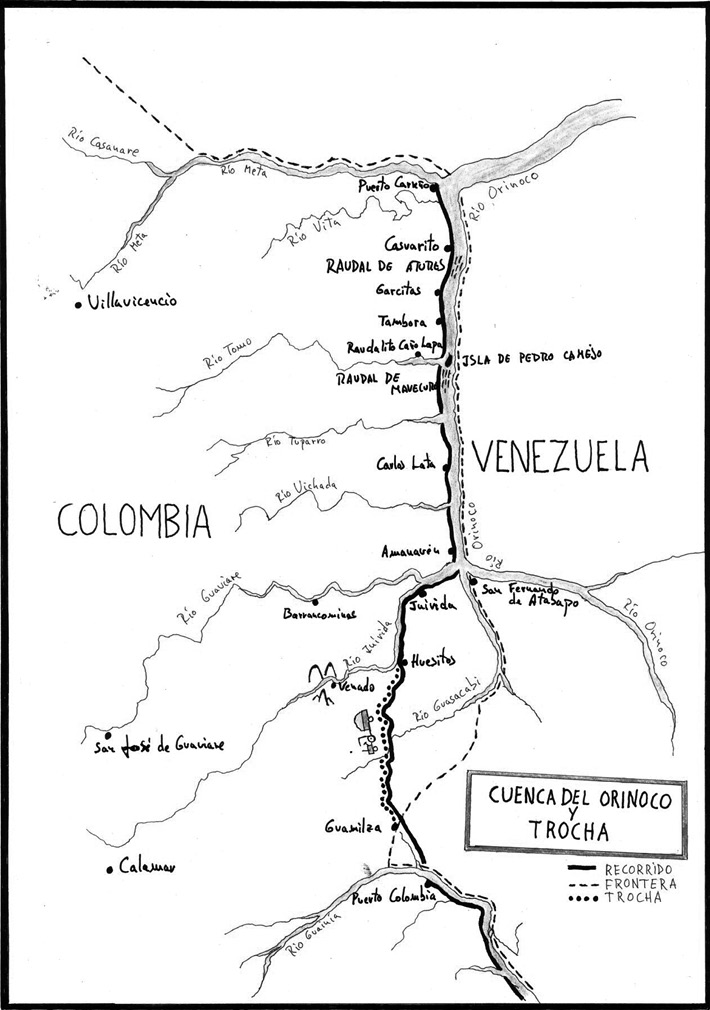 Lo que viene a continuación se concibió al transitar, en 2017, sobre las lindes que separan Colombia de Venezuela y Brasil poco después de la firma de unos acuerdos de paz que implicaban, por parte de los guerrilleros de las FARC, el abandono de sus armas y territorios, entre ellos los de la frontera orinoco-amazónica.