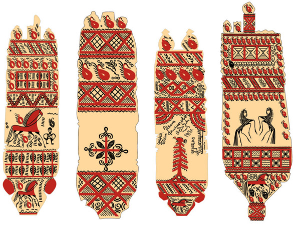 Фольклорные и этнографические данные говорят, что конь и птица в палащельской росписи являются символами. Конь – символ мужчины, а птица – женщины. Часто их изображают вместе, причём обычно птицу рисовали на ёлке. Почему? Оказывается, в Мезенском крае с ёлками был связан интересный обряд – зарубание «новизны». И посвящён он был свадьбе.