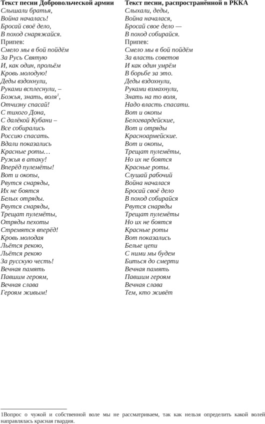 Прежде всего, примечательно обращение к потенциальному стороннику, слушателю в первом куплете песни: братья (в Добровольческой армии) и деды (в РККА). Братья – это обращение к равному. Деды – обращение к человеку, умудренному опытом в каком-либо деле. С точки зрения нашего подхода можно говорить о том, что красные пытались укомплектовать свою команду более сильными игроками (опытными), а это в большей степени свидетельствует об игровом поведении – плутовство, но в рамках приличий.