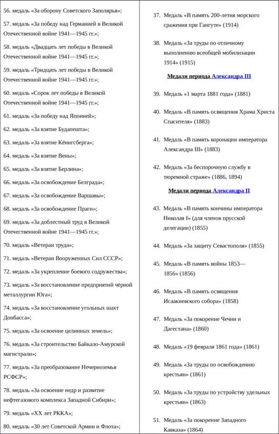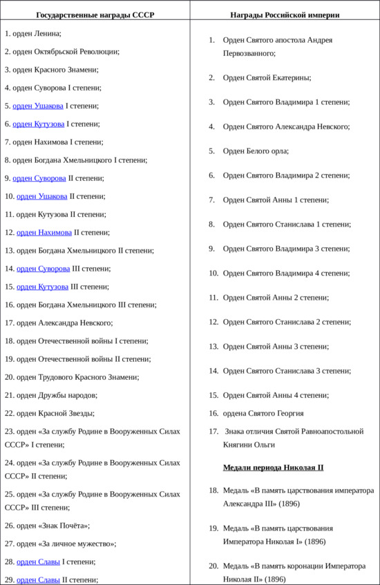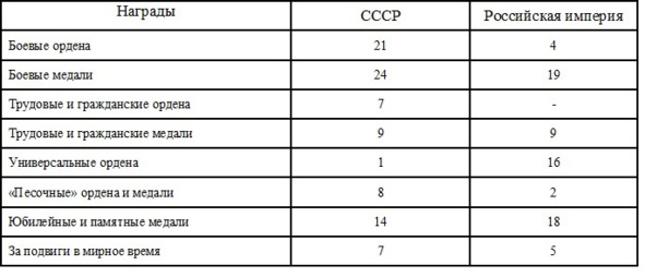 Мы решили сравнить отношение к подвигу в царской России. В качестве основания для сравнения вы выбрали количество государственных наград (только ордена и медали) Российской империи и СССР. Чтобы сравнение было более сопоставимым во временном плане, мы добавили в таблицу медали, учрежденные тремя последними императорами России (Николая II, Александра III и Александра II; последние 70 лет империи).